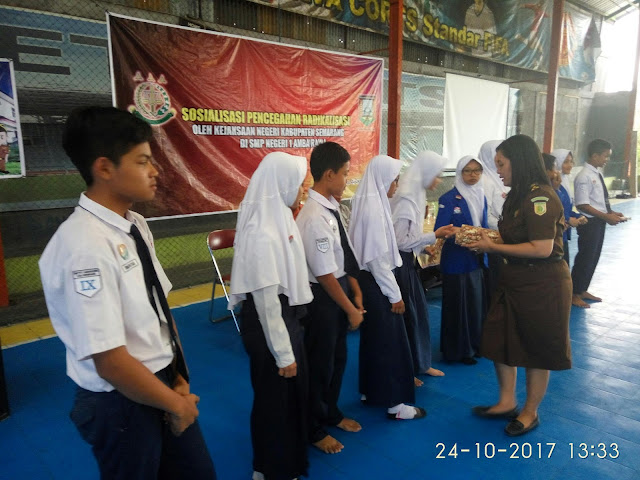Selasa, 24 Oktober 2017 telah diselenggarakan sosialisasi anti radikalisme di sekolah oleh pihak Kajari Kabupaten Semarang yang diwakili oleh Bpk Budi Wibowo beserta jajarannya. Kegiatan ini juga dihadiri perwakilan dari disdikbudpora yakni Bpk Djunaidi sekaligus sebagai pengawas dari SMP Negeri 1 Ambarawa. Kegiatan ini diawali dengan sambutan Kepsek SMP Negeri 1 Ambarawa yang berharap dengan adanya sosialisasi mampu meningkatkan pemahaman peserta didik terhadap paham radikalisme, dilanjutkan Bpk Djunaidi serta Bpk Budi Wibowo dari pihak Kajari.